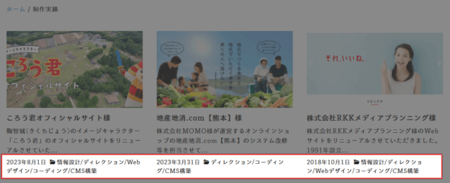 投稿一覧と同様に、カテゴリーが表示される箇所をカスタムタクソノミーに差し替えます。
